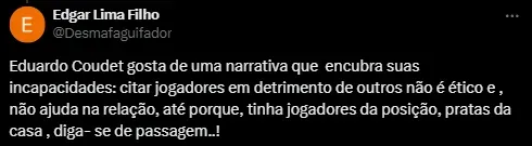“Todos têm responsabilidade. Montamos um elenco com objetivos a cumprir. Todos são cobrados, inclusive a comissão técnica. Mas não podemos desistir. É doloroso, é difícil dizer isso, mas continuamos acreditando que este grupo e comissão nos trarão vitórias. É uma convicção nossa. Todos serão cobrados. Já foram e continuarão sendo”, disse o presidente.