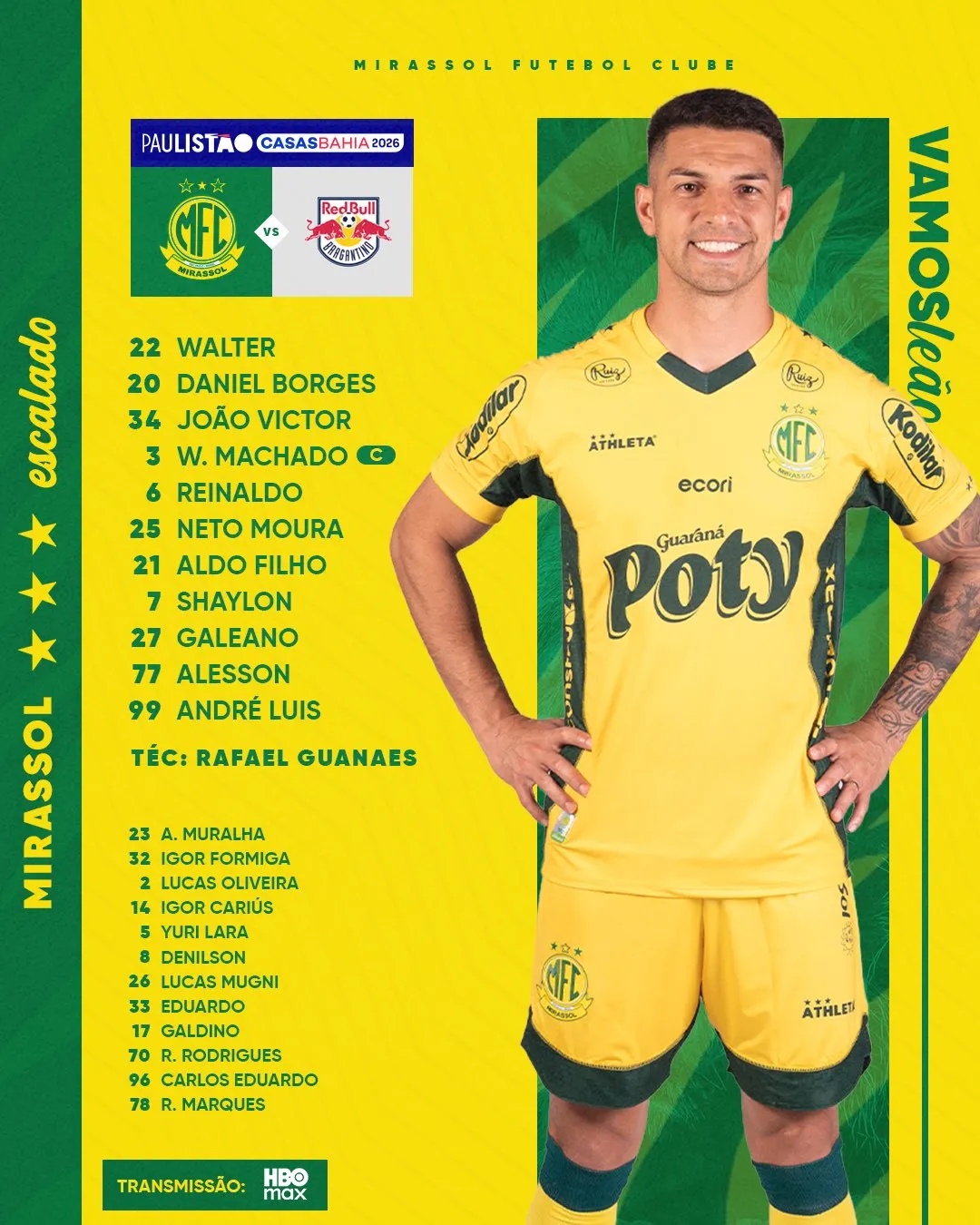 Do outro lado, o Red Bull Bragantino vive um cenário oposto. Líder da competição, o time soma nove pontos, tem ataque eficiente com nove gols marcados e ainda não foi vazado. Trata-se do melhor início de Campeonato Paulista da história do clube, que nunca havia vencido as três primeiras partidas da elite estadual. A meta agora é manter o embalo e defender a ponta da tabela.