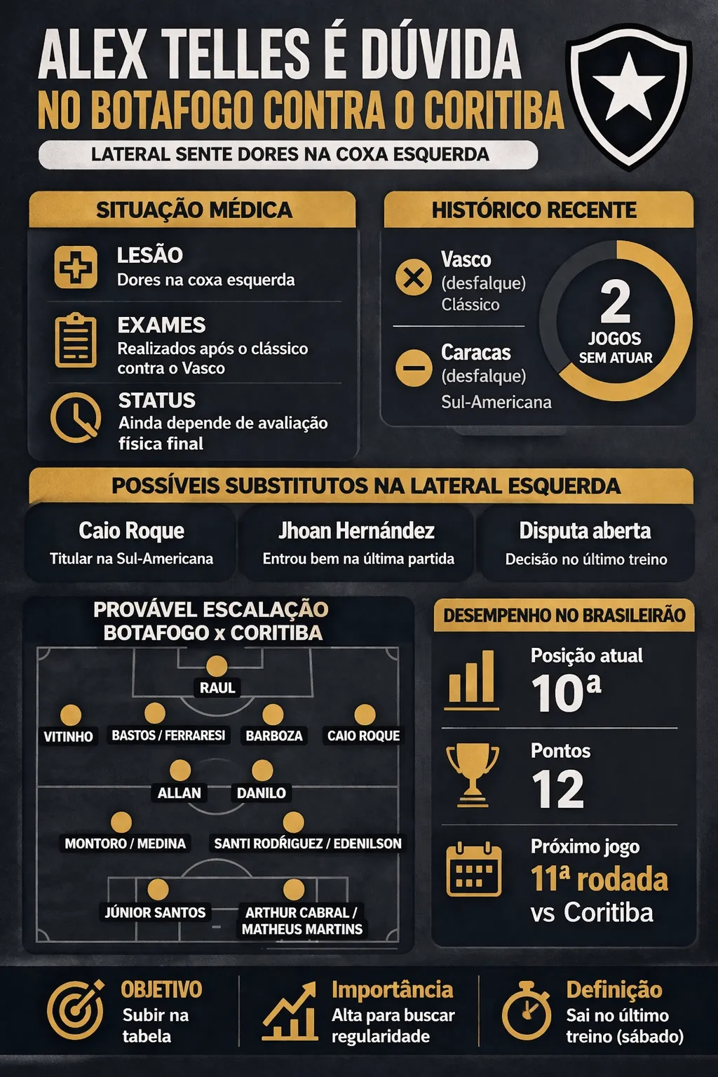 O Botafogo chega para o duelo contra o Coritiba com uma preocupação importante na lateral esquerda. Isso porque Alex Telles ainda não tem presença confirmada após sentir dores na coxa esquerda, situação que já o tirou da última partida da equipe.