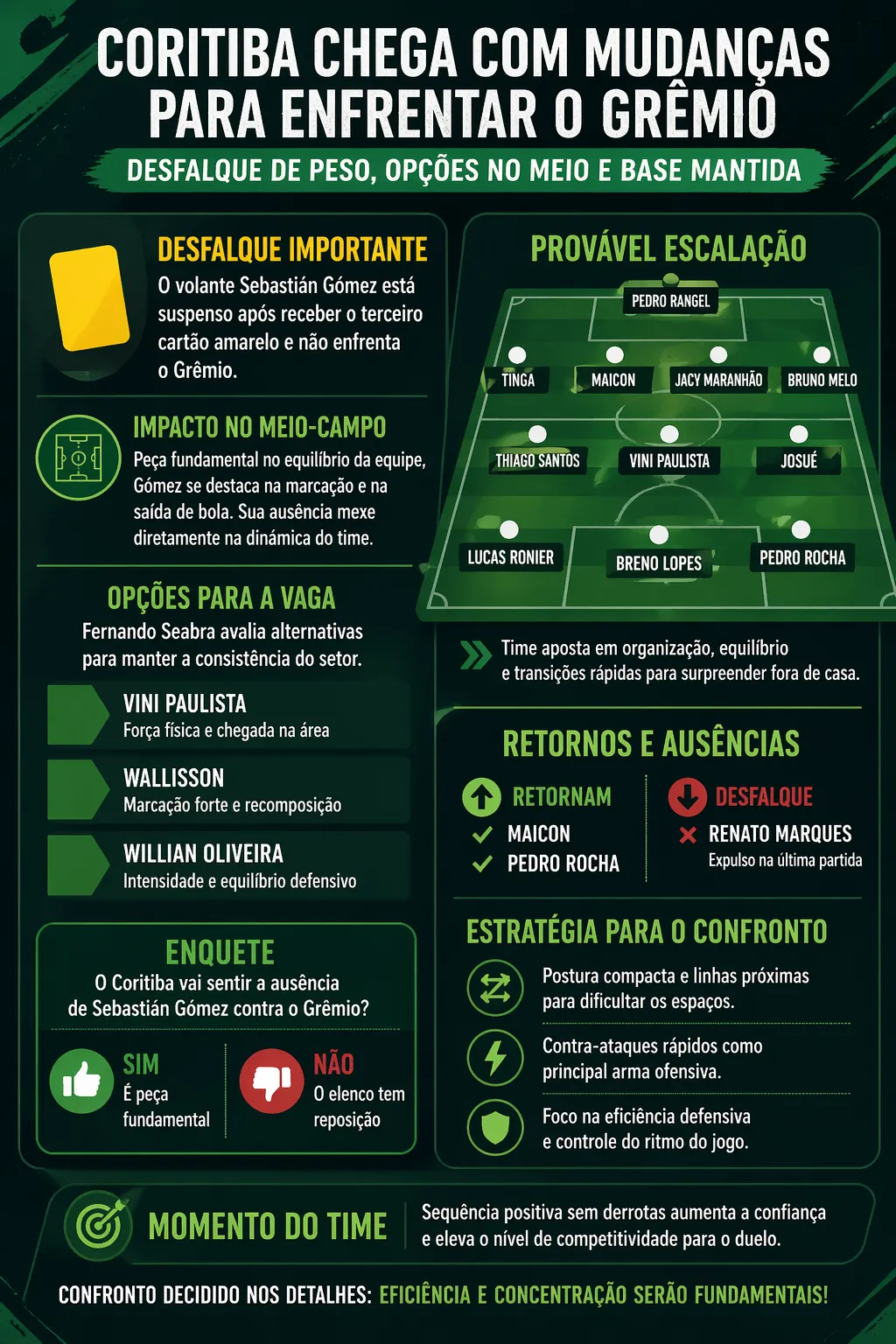O Coritiba chega para o confronto diante do Grêmio com uma ausência significativa. O volante colombiano Sebastián Gómez está fora após atingir o limite de cartões amarelos, o que obriga a comissão técnica a reformular o setor central.