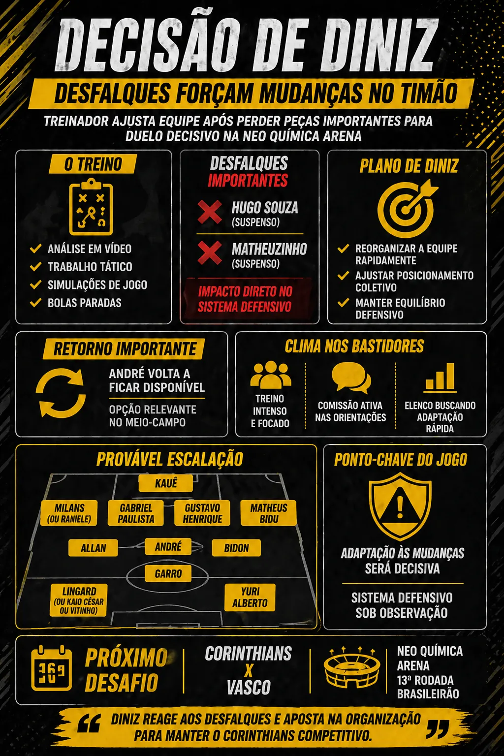 O Corinthians finalizou neste sábado os últimos ajustes para o confronto diante do Vasco, válido pela 13ª rodada do Campeonato Brasileiro. Entretanto, mais do que um simples treino, a atividade comandada por Fernando Diniz deixou claro que mudanças serão inevitáveis para o duelo marcado para domingo, às 16h, na Neo Química Arena.