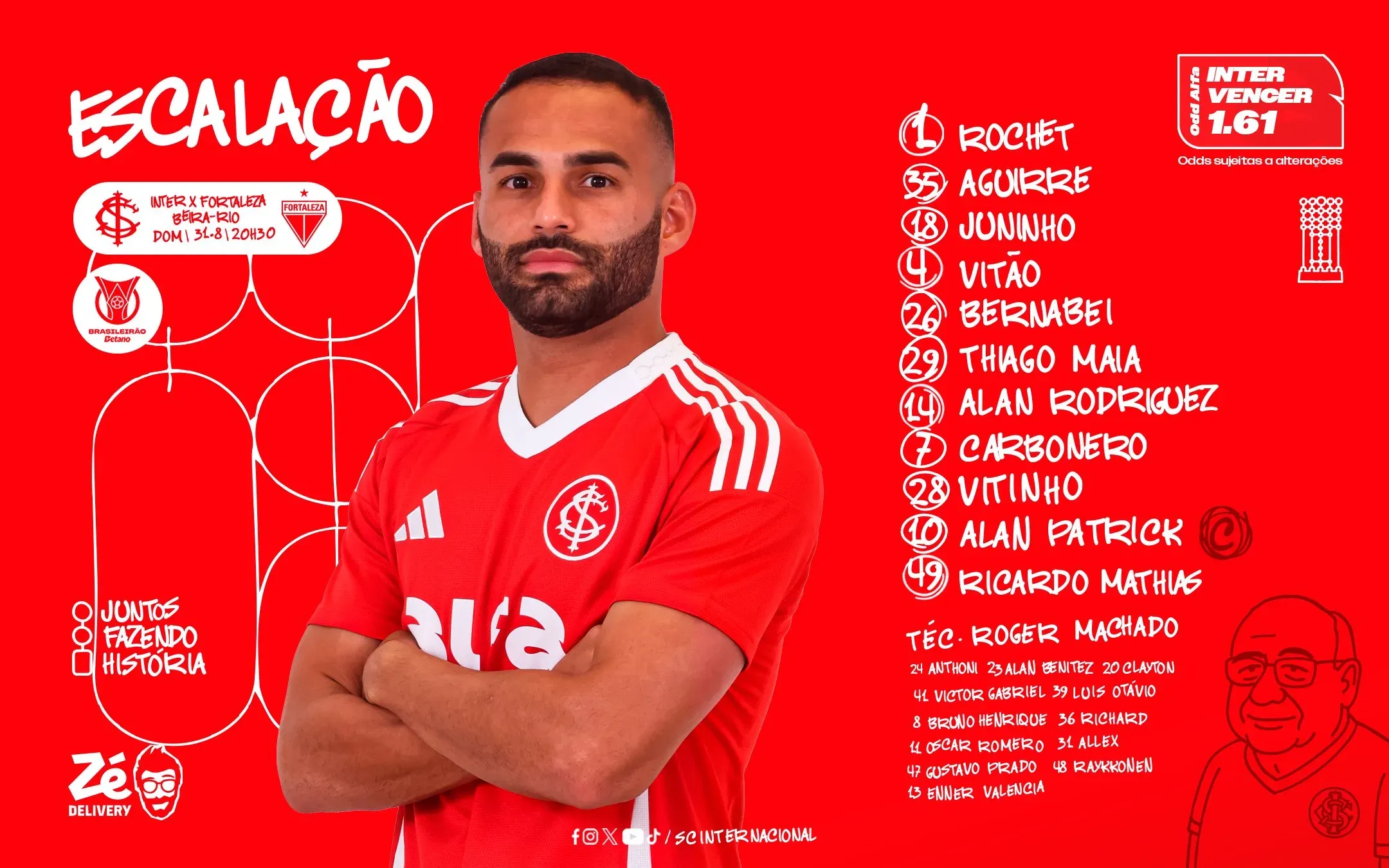 O primeiro tempo no Beira-Rio terminou empatado em 1 a 1 entre Internacional e Fortaleza. O Colorado abriu o placar aos 25 minutos, com Alan Patrick convertendo pênalti, mas o Fortaleza respondeu aos 33 minutos, com Lucca Prior aproveitando cruzamento de Bruno Pacheco e igualando o marcador.