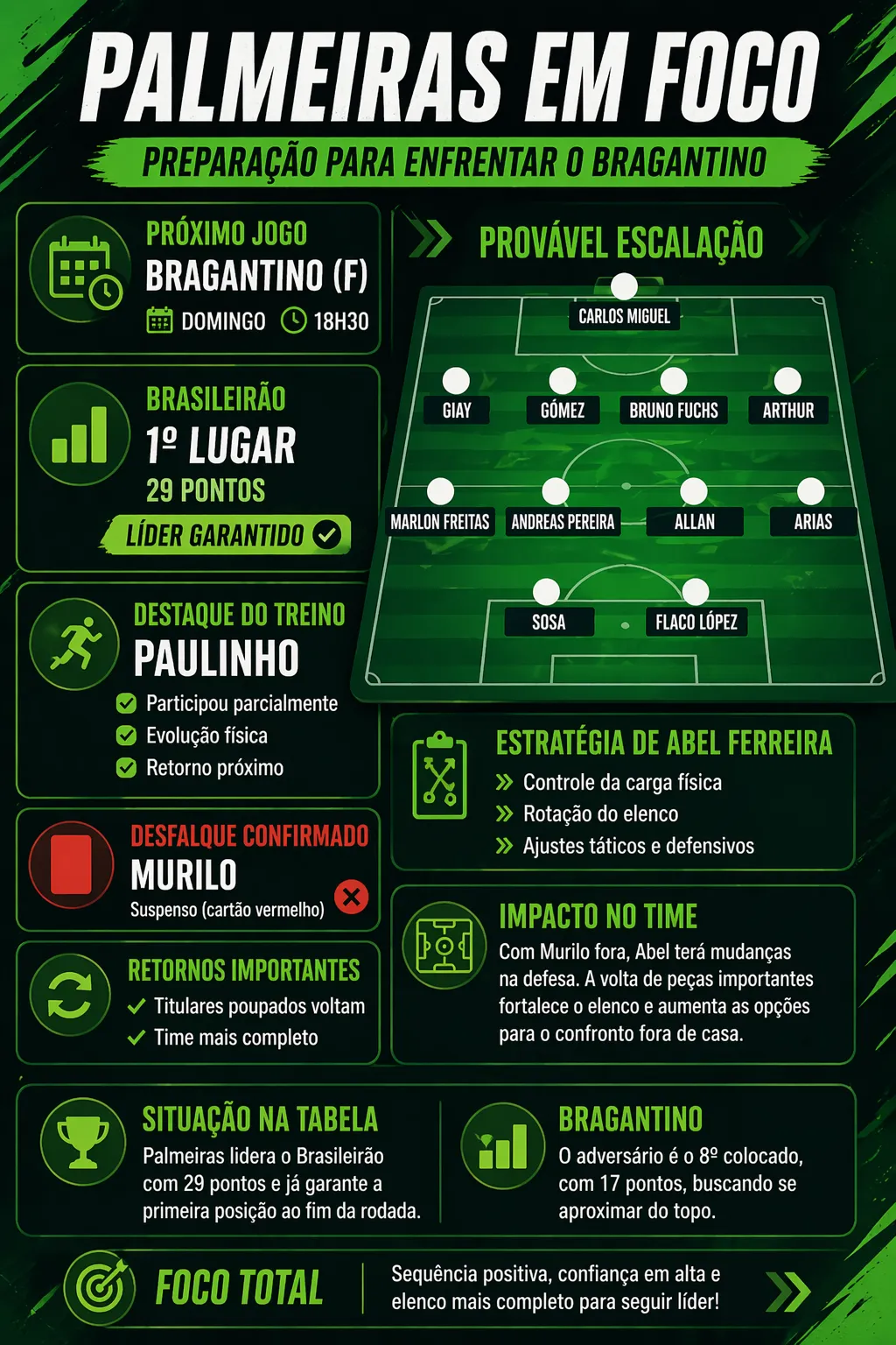 Por fim, o Verdão segue em situação confortável na tabela. Com 29 pontos somados, a equipe lidera o Campeonato Brasileiro e já está garantida na primeira posição ao fim da rodada. Enquanto isso, o Bragantino aparece na oitava colocação, com 17 pontos, buscando se aproximar do topo.