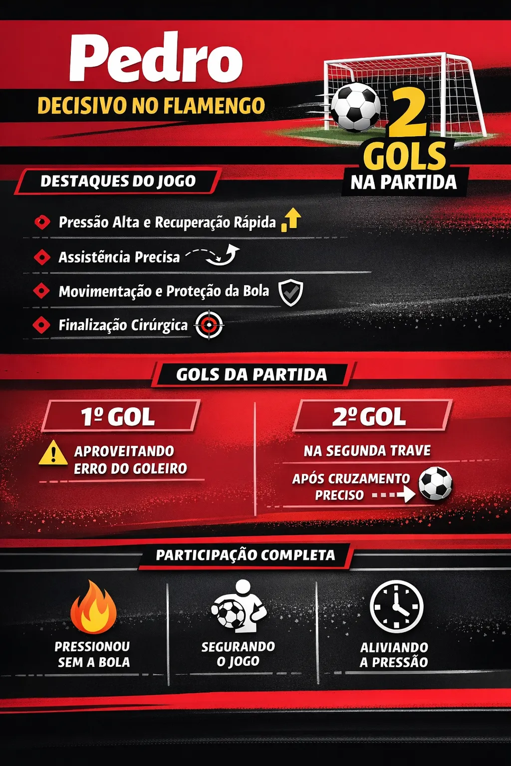 No primeiro tempo pelo Flamengo, a atuação de Pedro foi determinante não só pelo gol, mas principalmente pela forma como ele interpretou o jogo dentro da proposta de Leonardo Jardim. Diferente de um centroavante fixo, ele participou ativamente da pressão alta, posicionando-se para fechar linhas de passe e induzir o erro da saída tricolor.