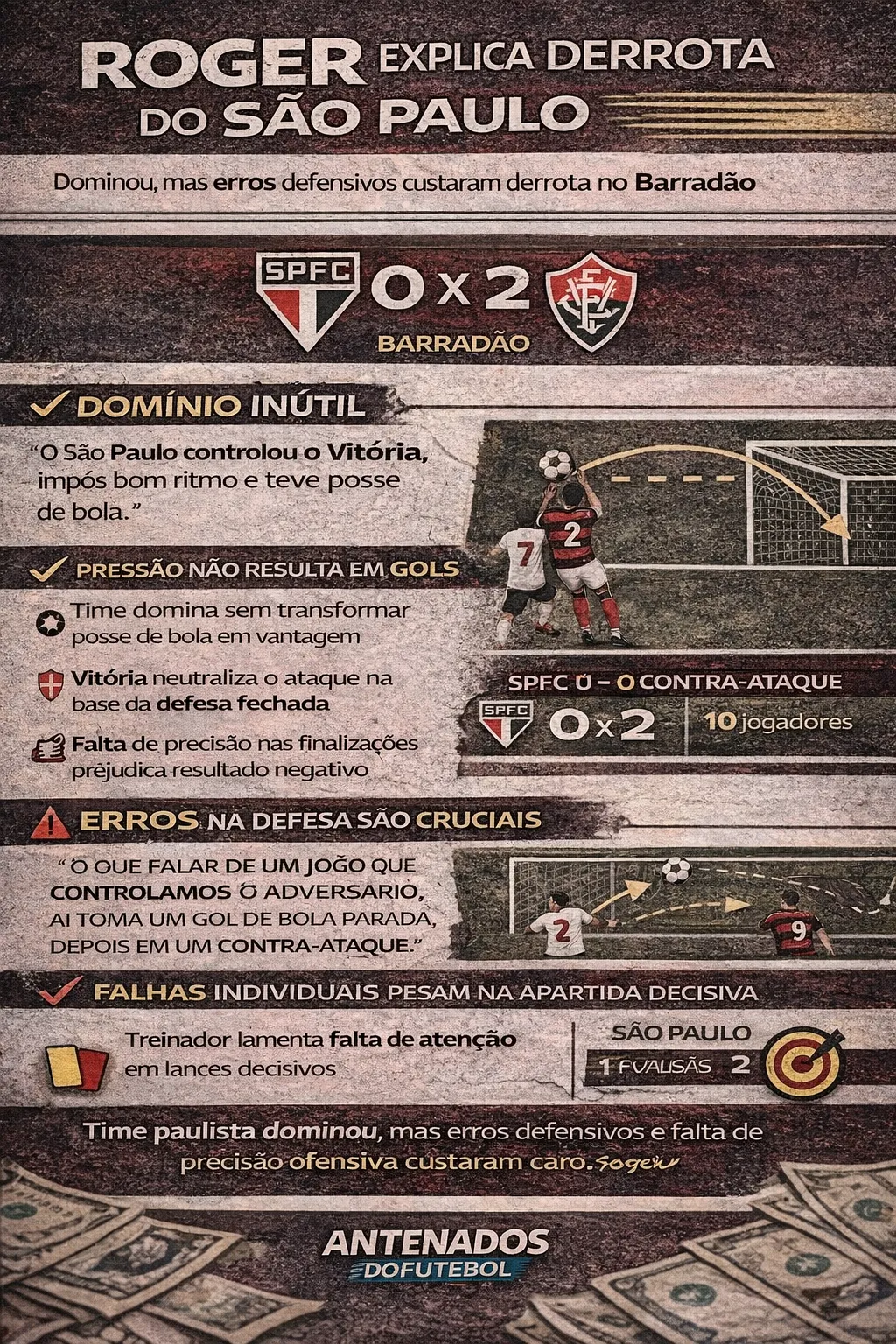 O técnico Roger Machado avaliou que o São Paulo teve controle da partida, mas acabou derrotado pelo Vitória por 2 a 0, no Barradão. Apesar da atuação considerada consistente em vários momentos, o treinador deixou claro que erros específicos foram determinantes para o resultado negativo.