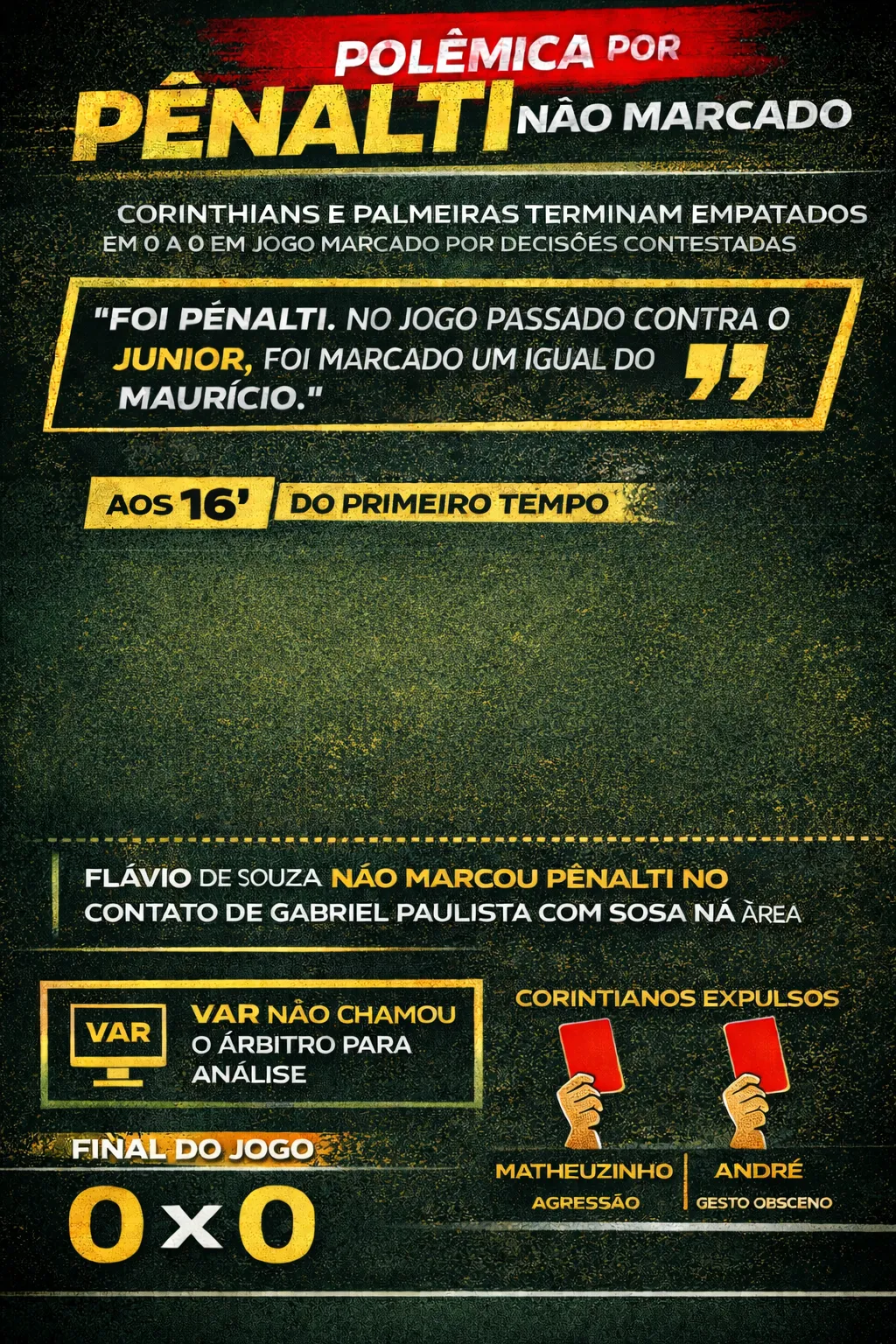 O empate por 0 a 0 entre Corinthians e Palmeiras, na Neo Química Arena, ficou marcado por decisões controversas da arbitragem e clima tenso durante toda a partida. Apesar da rivalidade intensa, o jogo teve poucos momentos de criação ofensiva.