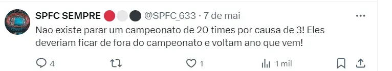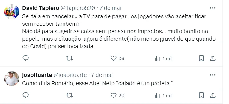 “Nestes 20 dias, todos os outros clubes continuarão treinando em seus estádios, mas Inter e Grêmio vão fazer o que? Volta em 20 dias, mas Grêmio e Inter ficaram parados. Ou cancela o Campeonato, ou Inter, Grêmio e Juventude estão fora e voltam ano que vem. Teria que pensar até em Libertadores e Sul-Americana”, disse o jornalista.