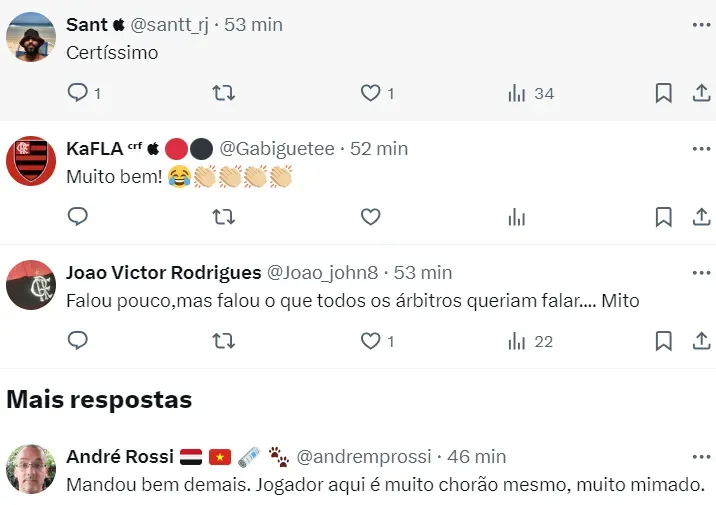 “Apenas não concordei com a falta dele, tão pouco ele é obrigado a me dar amarelo. Eu falo para eles, não estou reclamando do trabalho deles, se foi bem, se foi mal, o que eu vou falar é do comportamento dele com nós jogadores. O cara é muito boçal, a gente vai conversar com ele com todo respeito do mundo e ele dá as costas”, disse o camisa 7 na ocasião.