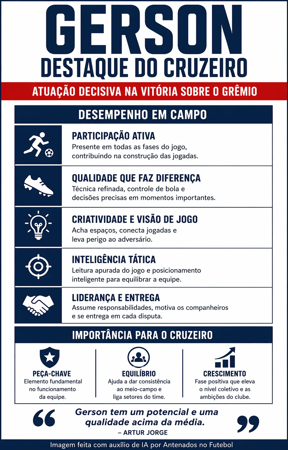 A atuação de Gerson contra o Grêmio reforça a própria ambição do jogador, que corre contra o tempo mirando uma convocação para a Copa do Mundo. Os elogios de Artur Jorge refletem um atleta que entrega intensidade, qualidade e leitura de jogo. Quando 100%, o Coringa já se provou um atleta de nível acima da média e postulante a titular da Seleção.
