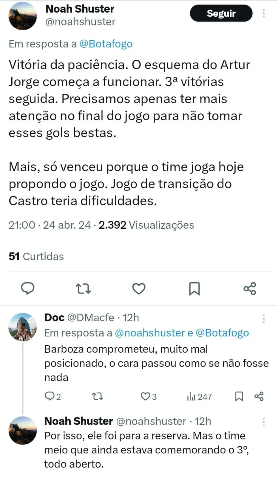 Apesar do pedido ter sido negado, Artur Jorge está empolgado para o clássico. “Vou começar a falar sobre a expectativa porque sou bem mais positivo do que você. Ganhamos três jogos e é isso que me alimenta.”, afirmou.