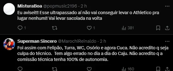 Cuca também mencionou o desgaste da equipe devido à sequência de jogos e viagens. O Athletico vem de uma série de três partidas fora de casa, incluindo jogos contra o Danubio, no Uruguai, pela Sul-Americana, e o Juventude, em Caxias do Sul, pelo Brasileiro.