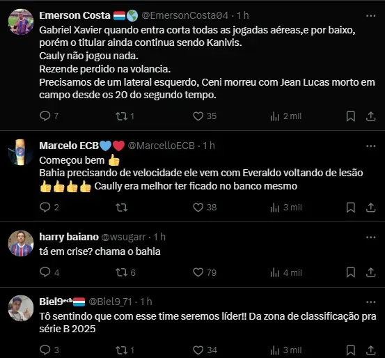 Biel, o autor do gol do Bahia, expressou sua decepção com o resultado. No entanto, ele ressaltou a necessidade do time se recuperar rapidamente para a próxima rodada. Na terça-feira, o Bahia enfrentará o Fluminense na Fonte Nova.