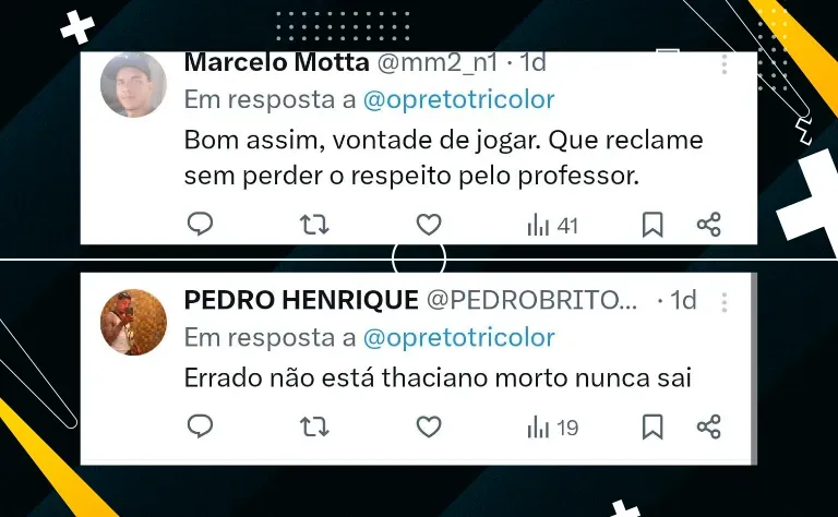 Rogério Ceni comentou a reação do jogador e justificou a substituição. “Acho que isso é normal do atleta. Qualquer um que saia… Tem que lembrar que ele foi escolhido para entrar antes de sair e que o jogo não ofereceu para ele os confrontos. O Damian marcou ele bem, Biel não levou vantagem”.