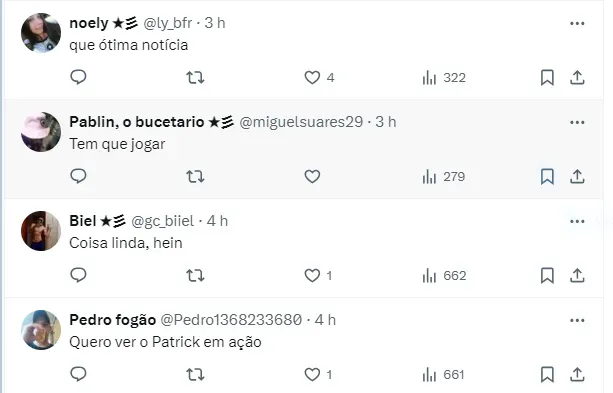 Segundo o GE, Patrick de Paula e Jeffinho devem ser relacionados no Botafogo para a segunda partida da final da Copa Rio. A expectativa era de que o volante retornasse apenas para a estreia da Libertadores, mas a recuperação vem sendo um sucesso.