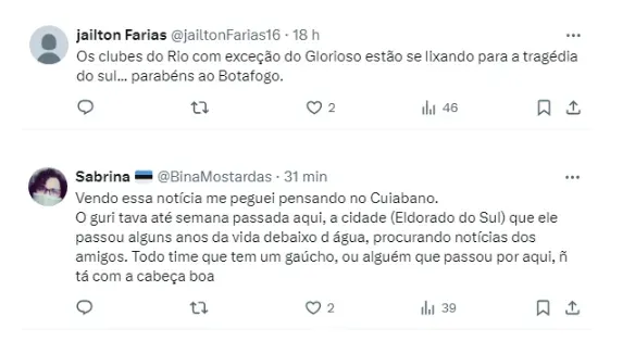 Do outro lado, o Atlético-GO também se mostrou contra parar o torneio nacional, mas sugeriu que a CBF abrisse a Granja Comary para disponibilizar aos clubes gaúcho. Fortaleza, Cruzeiro, Bragantino, Bahia, Corinthians e Vitória também se mostraram solidários, mas com pé atrás em relação a pausa da competição de pontos corridos.