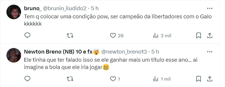 Ler mais: Jogador do Atlético-MG revela que ficou com ‘pé atrás’ e ‘puxou fixa’ de Milito