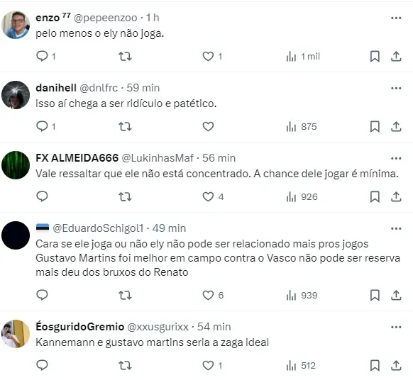 Ou seja, como não houve intervenção direta na partida, já que o clube não fez uso da substituição extra, o jogador do Grêmio poderia ser uma exceção ao protocolo e estar disponível para Portaluppi. Entretanto, o defensor não concentrou para o duelo e é dúvida. Ely o possível titular é ‘detonado’ pela torcida na web.