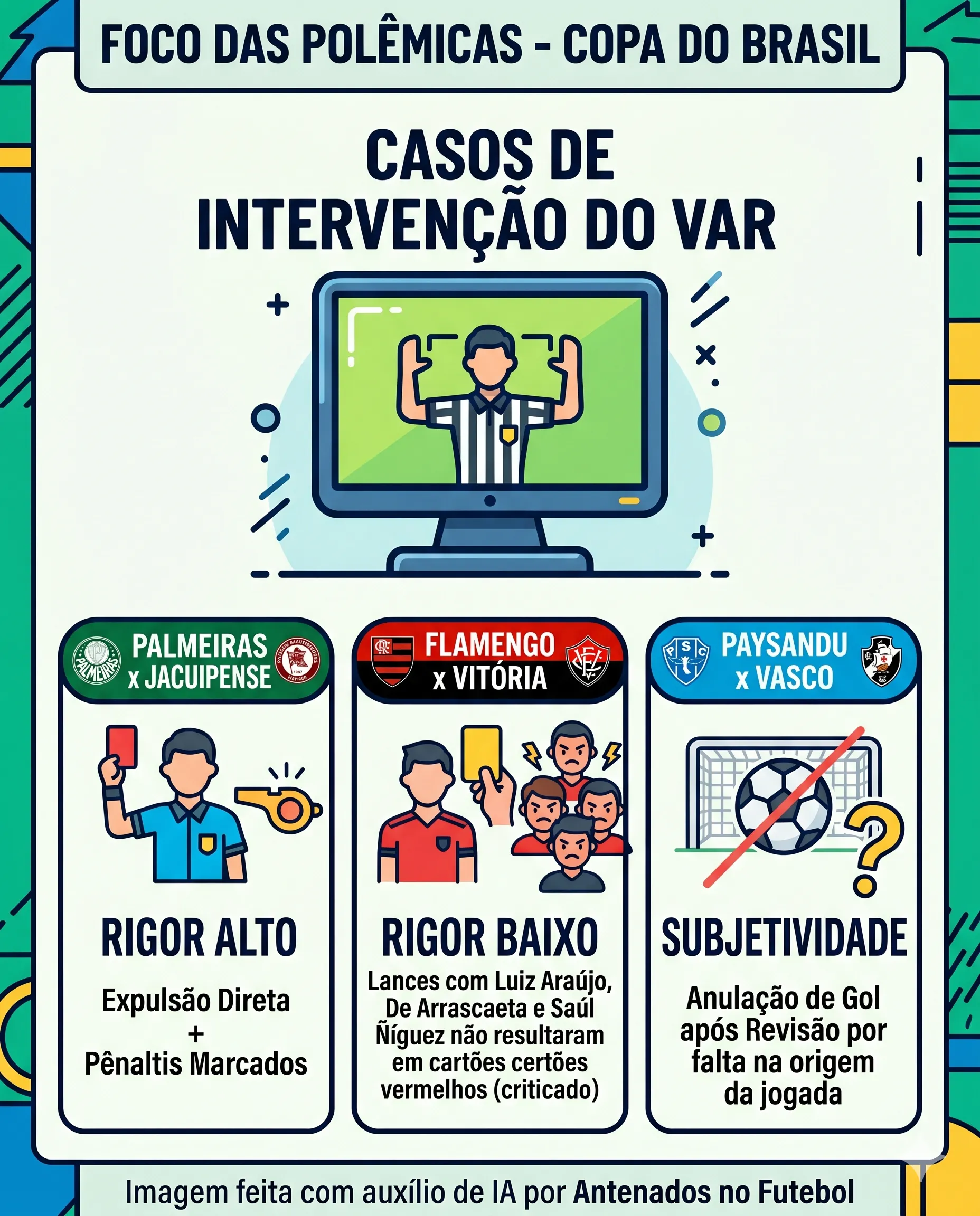 O confronto entre Palmeiras e Jacuipense foi um dos mais emblemáticos. A expulsão direta de um jogador da equipe baiana dividiu opiniões, enquanto a sequência de pênaltis marcados, com interferência do VAR, aumentou a sensação de excesso de intervenção tecnológica.