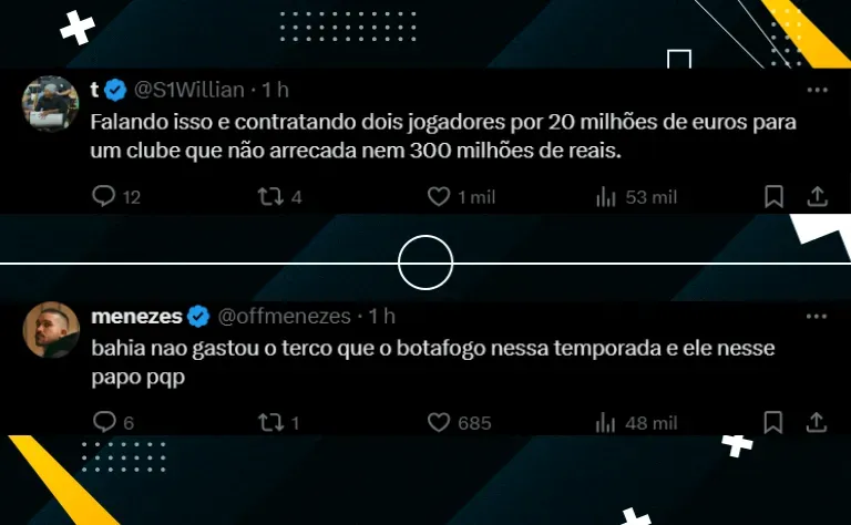 “Esse é meu aviso para Corinthians, Palmeiras, Flamengo… Se não fizermos algo, vamos acordar daqui a 70 anos, sob a atual estrutura administrativa, com as pessoas que estão aqui hoje, o Bahia vai ganhar o Campeonato Brasileiro em 17 de cada 20 anos”, continua o dono do Botafogo.