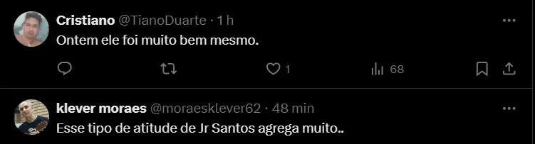 “Parabéns, irmão, tem entrado com muita garra e determinação. Precisamos de todos, e você tem entrado para agregar com o grupo. Parabéns pela partida de hoje”, escreveu Júnior Santos através do Instagram.