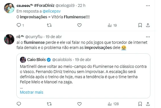 A torcida do Tricolor das Laranjeiras vem criticando Fernando Diniz nas últimas partidas pelo excesso de improvisações, principalmente no setor defensivo, com volantes jogando na zaga. Em entrevista coletiva o comandante rebateu as críticas. “Cito na Libertadores do ano passado, mesmo em 2022, houve muitos jogos em que usamos um recurso de colocar o time mais para frente e às vezes um volante na zaga.“, disse.