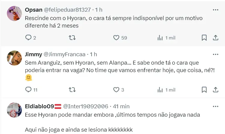 Em resumo, o treinador não conta com Hyoran e Charles Aránguiz para o embate. Vale ressaltar que o comandante argentino já tinha dois desfalques confirmados para o embate: o meio-campista Alan Patrick e o centroavante Enner Valencia.