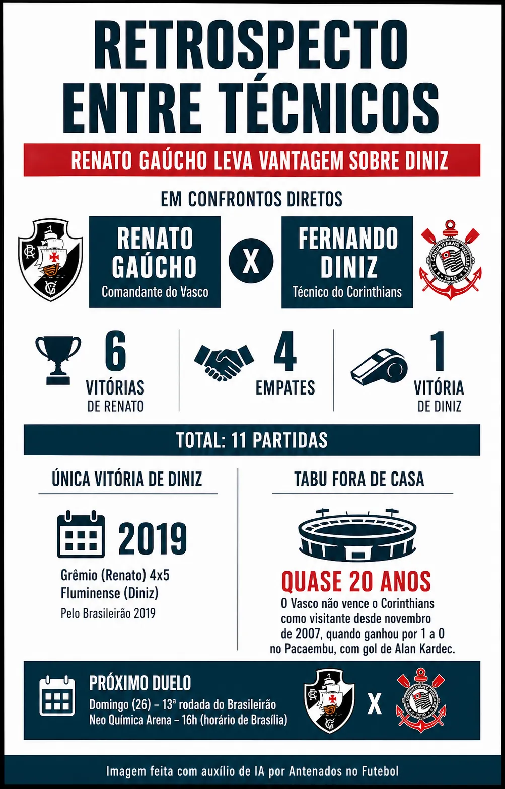 O retrospecto amplamente favorável de Renato sobre Diniz indica um duelo tático em que o treinador vascaíno costuma levar vantagem, especialmente pela objetividade contra a posse de bola adversária. Ainda assim, o futebol raramente respeita números isolados, e um jejum de quase duas décadas fora de casa contra o Corinthians é um fator psicológico que pesa. Se o Vasco quiser transformar estatística em resultado, vai precisar de execução e frieza.