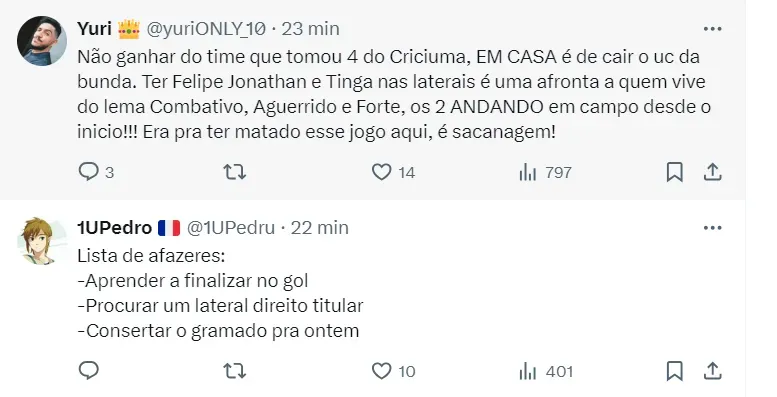 Somente os donos da casa finalizaram 16 vezes, seis na direção do gol. A falta de pontaria foi criticada pelos torcedores nas redes sociais. O Fortaleza desperdiçou muitas chances de abrir o placar.
