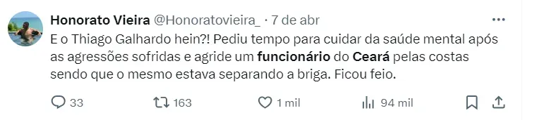 Um funcionário do Alvinegro foi agredido por Thiago Galhardo, jogador do Leão, logo após o apito final da partida, que culminou com a vitória do Vozão nos pênaltis, garantindo o 46º título do Campeonato Cearense para o clube de Porangabussu.