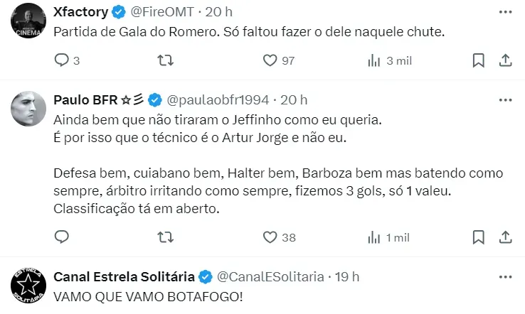 “Planificamos a partida pensando no que analisamos nos últimos jogos do Botafogo, principalmente na vitória na Libertadores e na vitória contra o Flamengo. A gente conseguiu anular bem a equipe do Botafogo e teve posse de bola. O primeiro tempo foi satisfatório, talvez com um pouco mais de capricho a gente teria algumas chances melhores. Mas foi um bom primeiro tempo”, disse.