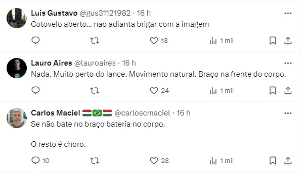 Para PC de Oliveira, comentarista de arbitragem do SporTV, falou que o árbitro acertou na não marcação da penalidade. “Seria pênalti se tivesse batido no cotovelo. Se não batesse no braço, pegaria no corpo”, disse em análise.