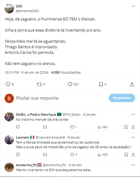 A falta de defensores algo que vem incomodando tanto torcedores quanto comentaristas. Roger Flores, ex-jogador e comentarista do Sportv, pediu para a diretoria do Nense a contratação de um atelta para a posição após a saída de Nino.