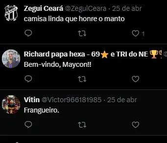 “Meu primeiro contato foi muito rápido porque eu já queria vir, então facilitou nosso acerto. Quando chegou o convite do Ceará eu dei um sim de imediato. Eu estou muito feliz com a possibilidade de ajudar o Ceará a conquistar seus objetivos até o final desta temporada”, disse o jogador.