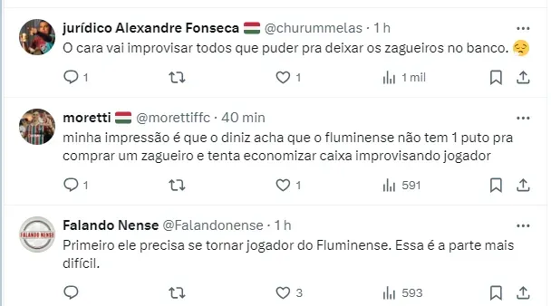 Neste domingo (14), de acordo com o jornalista Caio Blois, do Trivela, Diniz pode testar mais um meio-campista como defensor. Trata-se de Gabriel Pires, o ex-Botafogo vem sofrendo com lesões desde que chegou ao Tricolor, atuando pouco.