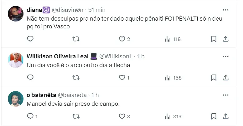 “Acredito que foi pênalti. Tem a interpretação do árbitro, mas a bola foi na direção do gol e bateu na mão do jogador (Manoel). Apesar da interpretação do árbitro, se a bola vai na direção do gol tem que ser pênalti. A bola não iria para fora e nem para um jogador deles. Tinha que ser pênalti, mas lamentavelmente ele não marcou”, afirmou.
