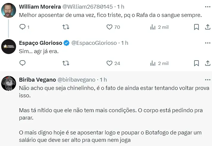 “O atleta foi submetido a exames de imagem no joelho esquerdo, que confirmou fratura por estresse na patela. Rafael já iniciou tratamento e a previsão de retorno é de oito semanas”, comunicou o Botafogo.