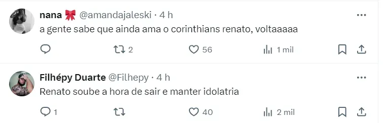 “É emocionante (ser aplaudido), mas ao mesmo tempo você tem que estar concentrado no jogo. Como eu falei, uma vida aqui dentro de conquistas e momentos também difíceis, e conseguir escrever uma história bonita dentro de um clube como o Corinthians, ter o reconhecimento do torcedor, reconhecimento dos amigos que ainda estão, então foi uma coisa que eu vou guardar com carinho, com certeza”, complementou.