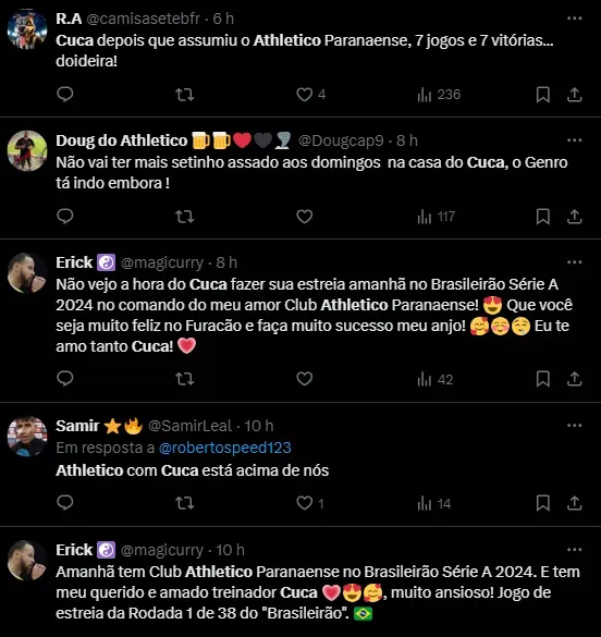 Agora, como bicampeão brasileiro (2016 e 2021), Cuca comanda o Athletico pela primeira vez na carreira. Ele busca manter seu aproveitamento de 100%, com sete vitórias em sete jogos. Na última semana, conquistou o bicampeonato Paranaense após uma vitória sobre o Maringá. A expectativa é alta para o jogo entre Athletico e Cuiabá, às 16h (de Brasília), na Ligga Arena.