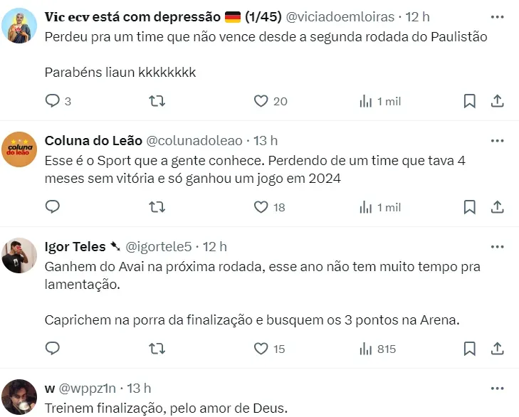 No entanto, a equipe pernambucana acabou surpreendida pelo Ituano, perdeu por 1 a 0 e sofreu a primeira derrota na Série B de 2024. Em resumo, o Sport teve muitas chances para conseguir mais uma vitória na competição, mas não aproveitou.