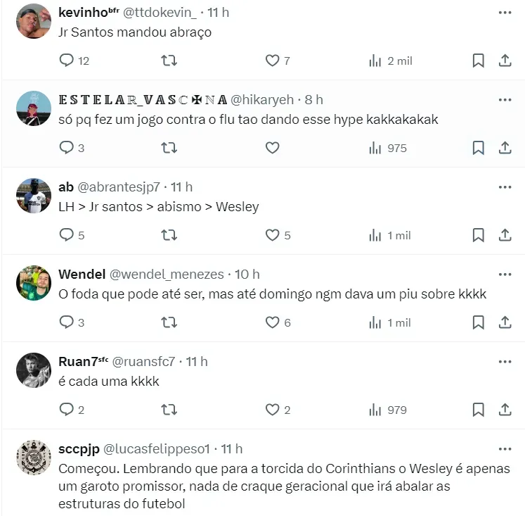 Em entrevista coletiva pós-jogo, o técnico Marquinho Santos, do América, fez questão de rasgar elogios para Wesley e afirmou que a promessa do Timão é o maior e melhor driblador do futebol brasileiro atualmente.