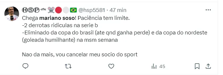 “Sempre temos falado que toda competição é um estímulo e uma ambição muito grande para nós. Agora, nossa força, nossa qualidade e nossa capacidade tem que estar sustentada para colocar o Sport novamente na Série A. Hoje há a decepção do nosso torcedor, mas não encontro reprovação. Temos que colocar toda a nossa força e mudar essa derrota em capacidade de continuarmos juntos. O vestiário hoje é de dor, mas muito unido”, disse.