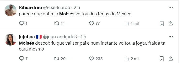 “Hoje o Fortaleza foi absoluto dentro do jogo com uma estrela absurda chamada Moisés”, escreveu um torcedor nas redes sociais. “O Moisés sendo recuperado é literalmente uma contratação no próprio elenco”, disse outro.