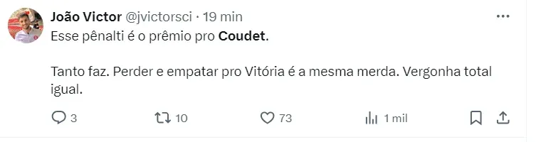Nas redes sociais, a torcida do Internacional pegou no pé de Eduardo Coudet. Para alguns, o treinador não foi ousado na formação, para outros, seria o momento do técnico ser demitido.