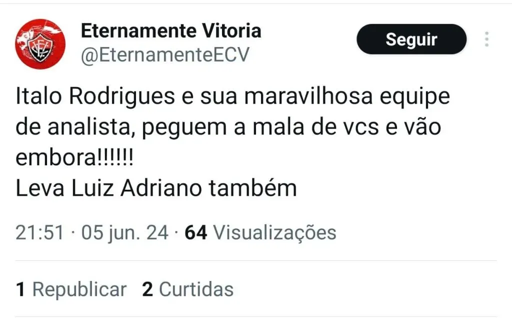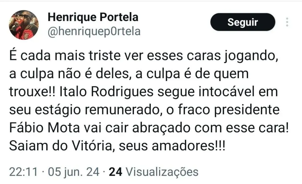 “É cada mais triste ver esses caras jogando, a culpa não é deles, a culpa é de quem trouxe!! Italo Rodrigues segue intocável em seu estágio remunerado, o fraco presidente Fábio Mota vai cair abraçado com esse cara! Saiam do Vitória, seus amadores!!!”, protestou outro também através da rede social (Henrique Portela – @henriquep0rtela)