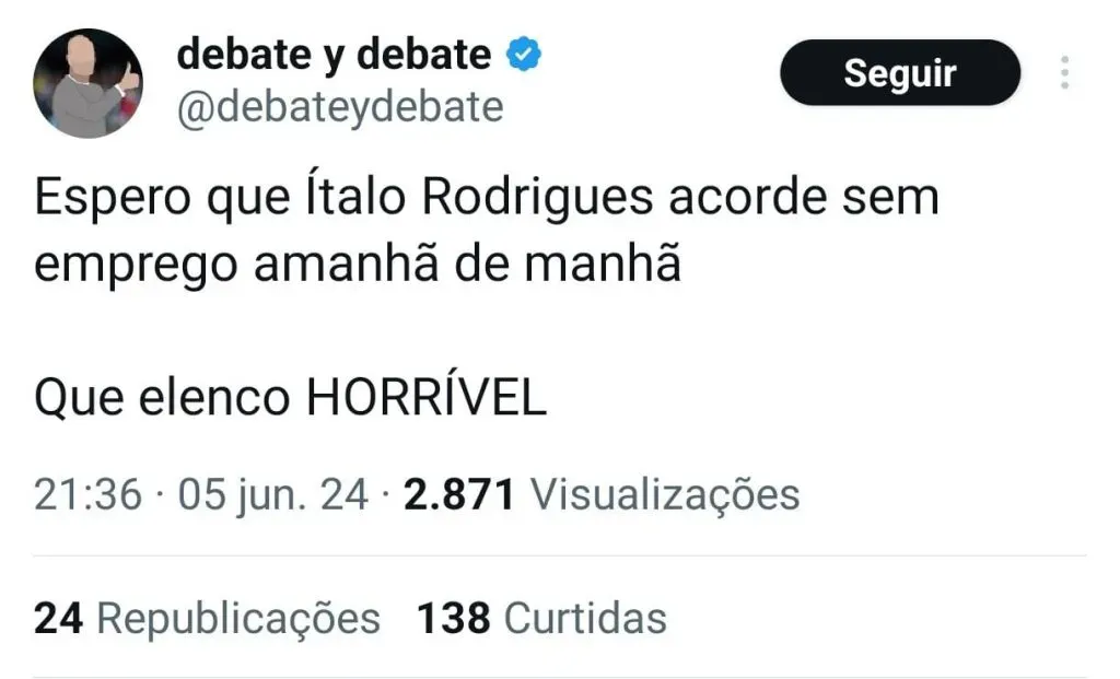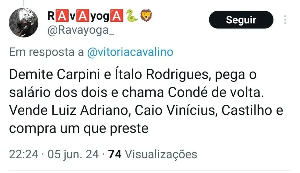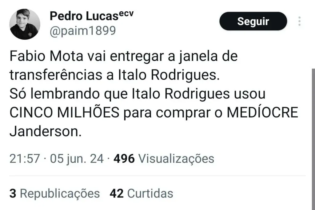 “Fabio Mota vai entregar a janela de transferências a Italo Rodrigues. Só lembrando que Italo Rodrigues usou CINCO MILHÕES para comprar o MEDÍOCRE Janderson.”, postou um internauta através do X (Pedro Lucasᵉᶜᵛ- @paim1899).