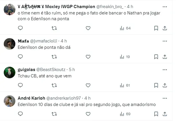 “O time nem é tão ruim, só me pega o fato dele bancar o Nathan pra jogar com o Edenilson na ponta”, disse um torcedor no X, antigo Twitter. “Edenilson 10 dias de clube e já vai pro segundo jogo, que amadorismo” , disse outro. “Edenilson de ponta não dá”, comentou outro torcedor.