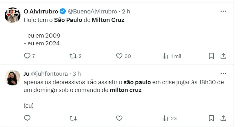 Enquanto o argentino Luis Zubeldía é anunciado como o novo treinador do São Paulo a partir da próxima semana, Milton Cruz assume temporariamente o comando da equipe. Cruz já teve passagens por outros clubes, como Figueirense e Sport, porém, sem grande sucesso.