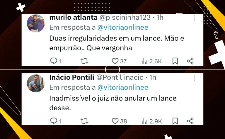Até mesmo torcedores do Cruzeiro admitiram que o Vitória pode ter sido prejudicado pela arbitragem: “Até que enfim o VAR nos ajudou, merecemos depois de ser prejudicados na maioria dos jogos”, postou M a t h e u s ! 🦊 (@ISlower01).