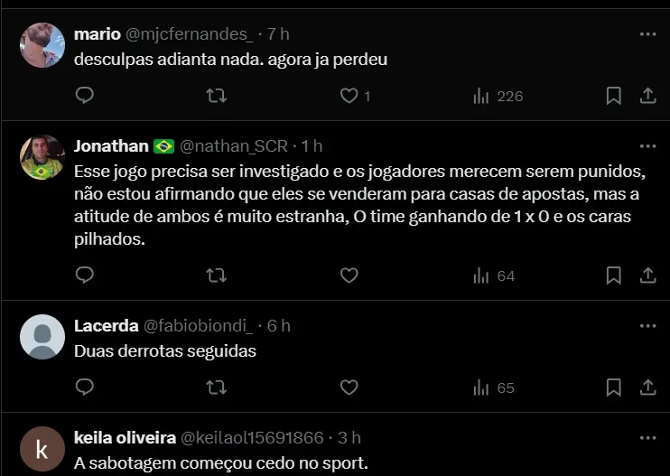 “Gostaria de pedir desculpas à torcida do Sport pelo acontecido hoje (…) realmente me excedi e fui irresponsável. Assumo a responsabilidade também pelo resultado, quero pedir desculpas aos meus companheiros e dizer que sinto orgulho pelo o que eles fizeram hoje!”, escreveu Zé Roberto.