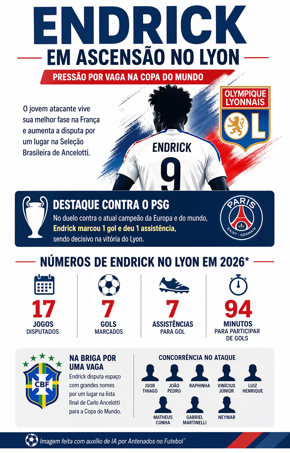 Na visão da redação, Endrick vem fazendo por merecer, sim, uma vaga na próxima convocação da Seleção Brasileira. O desempenho recente no Olympique Lyonnais, com participação direta em gols e protagonismo em jogos grandes, mostra que o atacante não é apenas uma promessa, mas uma realidade competitiva em alto nível.